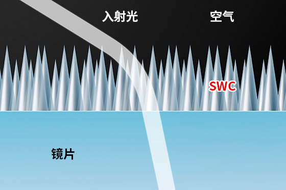 在镜片表面覆盖了包含二氧化硅与空气的具有低折射率的ASC(Air Sphere Coating)镀膜,和在镜片表面排列众多纳米级楔形结构的SWC亚波长结构镀膜,可有效抑制入射角较小的正面受光和入射角较大的侧面受光造成的反射。这两项镀膜技术可以有效地抑制鬼影和眩光的产生。