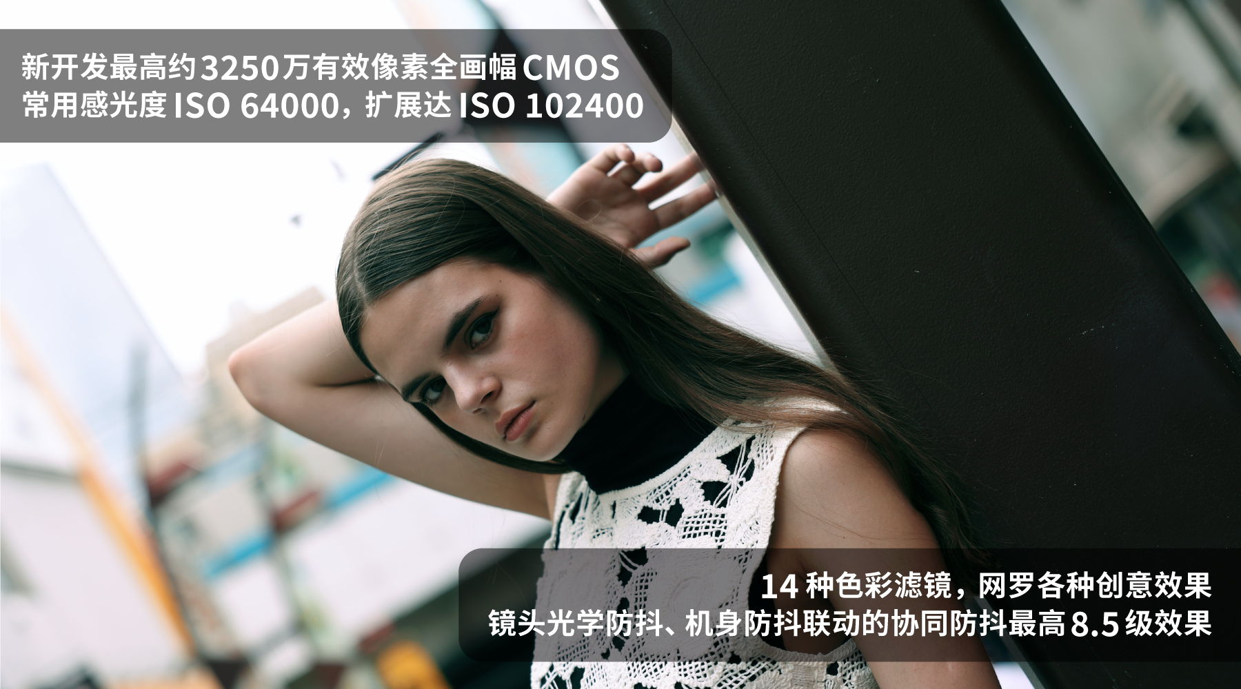 分辨力与创意性能提升相机使用了新开发的约3250万有效像素全像素双核CMOS图像感应器。相比前代机型,像素数提升了约830万,可实现更高精度的成像。高像素在后期裁切使用时可保留足够的画面分辨力,后期调整构图更游刃有余。机身支持5轴防抖,协同防抖最高8.5级效果。14种彩色滤镜方便用户轻松获得想要的色调。作为全画幅机型首次导入的平滑皮肤模式、高画质的全景拍摄、景深合成、基于HDR PQ的HDR拍摄等功能,为用户带来更多拍摄创意。