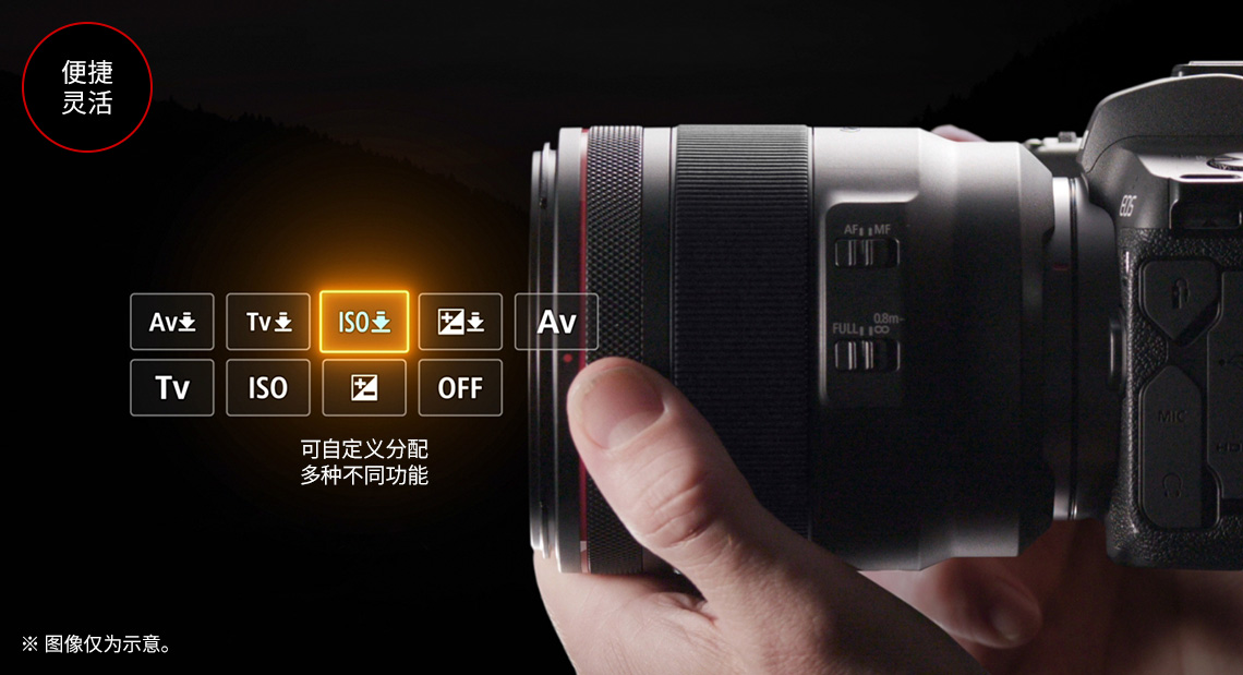 控制环功能可自定义,可以将原本由相机进行调整的光圈、快门速度、ISO感光度以及曝光补偿,分配到镜头的控制环上。