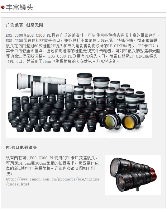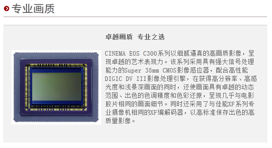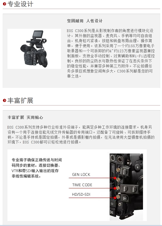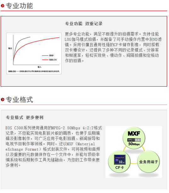 兼容超过60 款佳能EF 镜头,EF或者PL两种卡口机身,约829万有效像素,4:2:2 50Mbps 高码流格式,1920X1080 全高清记录,24P电影拍摄模式,双CF卡槽,支持无间断及双卡同时记录功能,防尘,防水滴设计,内置散热系统。