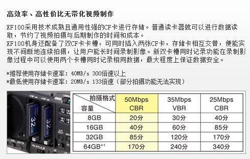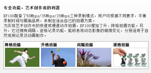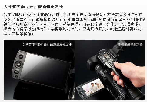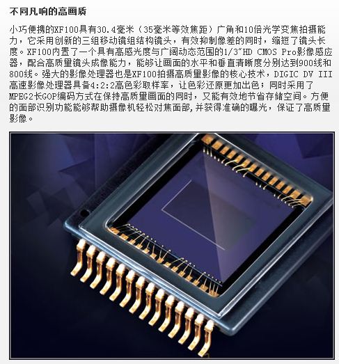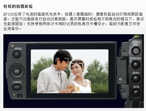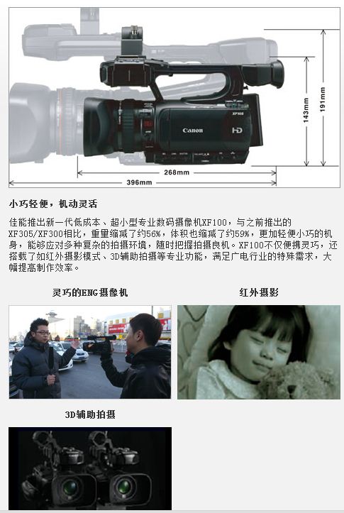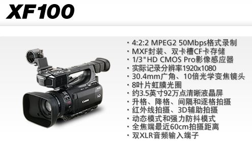 XF100小型专业高清摄像机采用了全新影像技术,第一次在如此小巧的机身上实现了能够满足广电行业高画质的要求,并辅以丰富的专业功能和广电行业专业接口,帮助用户提高工作效率。小巧灵活的机身更适合特殊场景和狭小场景的拍摄。XF100的重量仅有约1.16千克,与XF305/XF300相比,重量缩减了约56%,同时,体积较XF305/XF300也缩减了约59%,体积和重量的减少使机身更加紧凑,更加灵活。