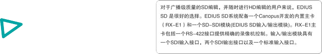 EDIUS SD是面向广播级演播室的实时SD在线编辑解决方案。系统采用独有的编解码技术,提供了SD无压缩、SD无损失、DVCPRO50、Canopus DV、Canopus HQ等多种视频编码,其配备的广播级接口箱可完美的与Digital Betacam、DVCPRO50、IMX、DVCAM、Betacam等广播级前后期设备连接,轻松的组成完备的广播级视音频编辑解决方案。