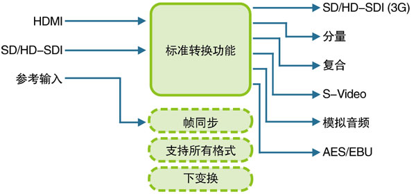 提供了HDMI、HD/SD-SDI(支持3G)到HD/SD-SDI、分量、复合、S-Video、AES/EBU、模拟音频的转换功能