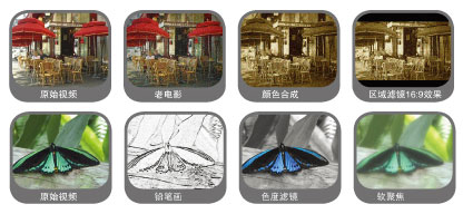 HD小旋风提供数十种不同的实时视频滤镜,每个滤镜都提供了操作简单却功能强大的调节参数以便进一步地控制视频效果。通过实时,多通道编辑的强大功能和智能关键帧控制,任何色键,亮键或者画中画效果可以立即回放和输出