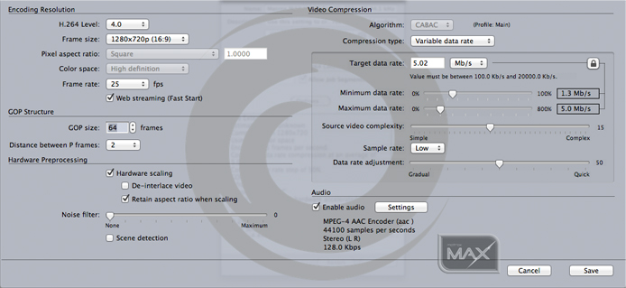 Customizable presets let you create tweak the power of MAX to fit your own unique requirements. You can choose to encode at a constant bit rate (CBR), a variable bit rate (VBR), or a constant quality, then choose other parameters to perfect the encode.