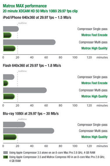 Matrox Fast Encode presets use the MAX hardware and your CPU to deliver H.264 files faster than realtime. Quality is better than Compressor Single-pass.