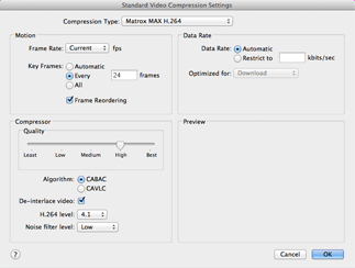 On the Mac, Adobe Media Encoder recognizes the Matrox MAX H.264 encoder as a QuickTime codec. There are two ways to capture QuickTime files – at a constant bit rate so quality varies depending on the complexity of each frame or at a constant quality so that quality is maintained while the bit rate varies. You can generate .mov files using Matrox MAX presets or you can create your own customized settings.