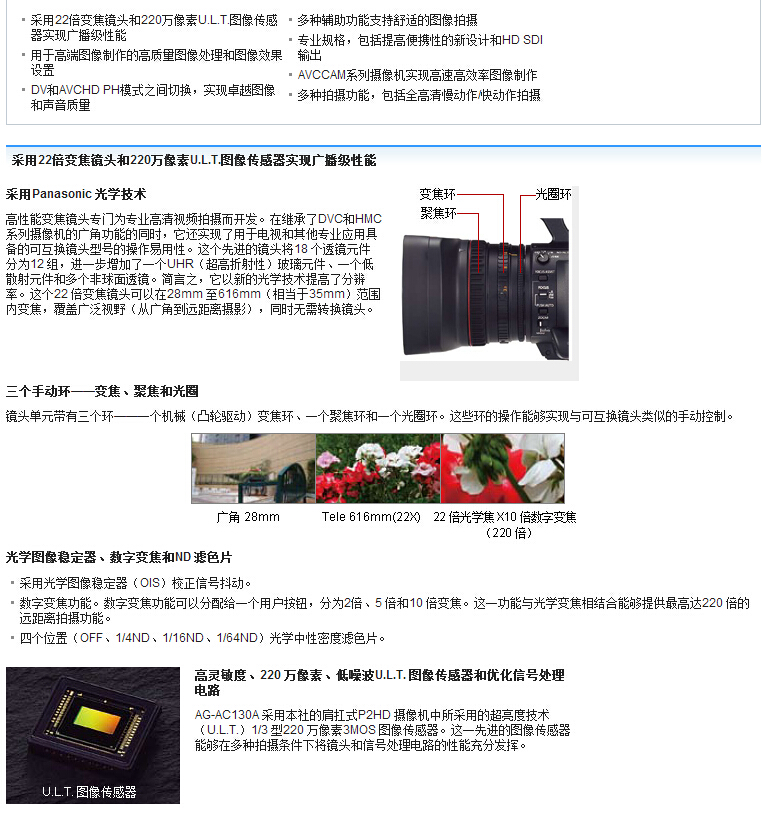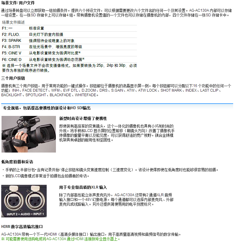 全高清高灵敏度1/3 MOS成像,220万像素,带有广角的22倍HD变焦镜头,Focus,Zoom,Iris 三环操作方式,ND:OFF,1/4,1/16,1/64,双SDXC卡记录,高清AVCHD格式,标清和记录DV格式,HD-SDI输出。 Panasonic在秉承AVCCAM系列的优良传统基础之上,AG-AC160MC在镜头的选择,接口的配置、操作的便捷性上,又有了新的改进。另外,双SD卡的配置,允许不间断接续记录和双卡同时记录,提供更高的可靠性。