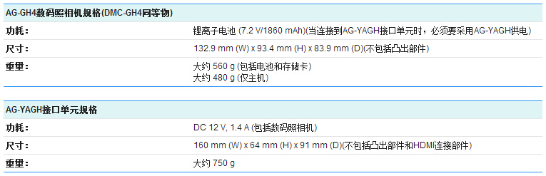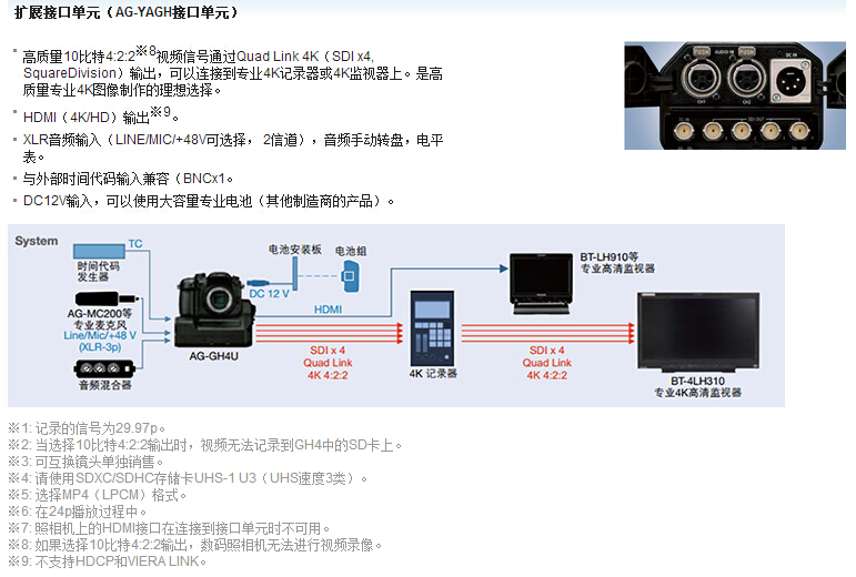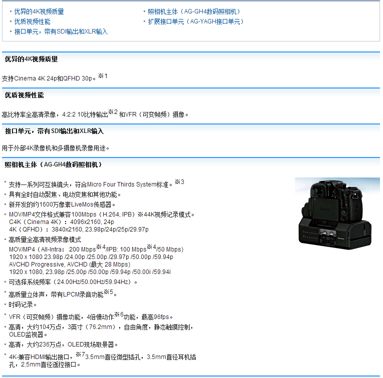 出色的4K视频质量,搭载专业接口单元 M4/3规格可互换镜头,新开发1600万像素传感器 支持本机记录4K和HD视频 接口单元支持4:2:2 10-bit 输出 4K 3G-SDI, HD-SDI输出 XLR 2路输入 12V DC输入