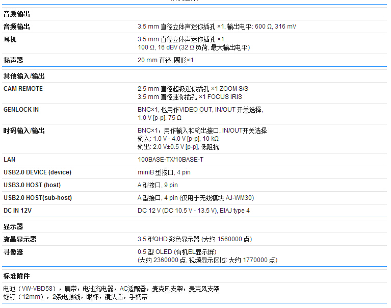 新设计的22倍变焦镜头 有线/无线局域网连接功能 采用新1/3型3MOS图像传感器实现高灵敏度和低噪音 行业第一款OLED 寻像器和高分辨率液晶面板 作为标准支持AVC-ULTRA编解码器 新设计—单独放置的XLR音频输入接口 通过Genlock IN和TC IN/OUT使多台摄像机同步 .