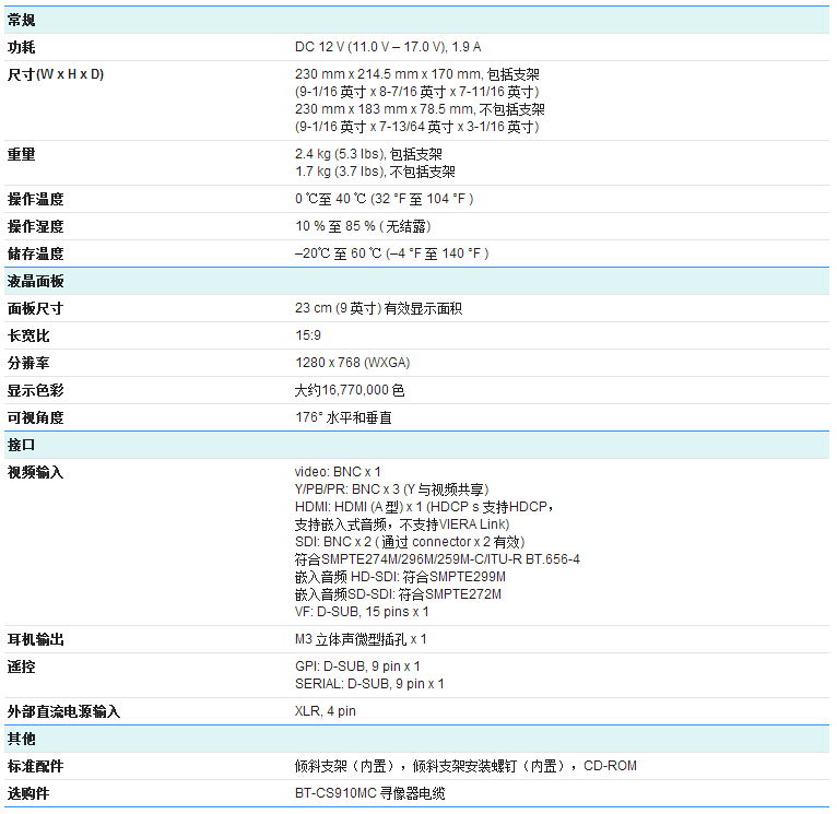 BT-LH910MC 9英寸宽屏高清液晶视频监视器