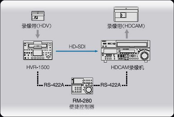 HVR-1500装有一个符合行业标准的RS-422A接口,可用于专业编辑应用。通过这个接口,可将此录像机与其它Sony录像机、编辑控制器(如Sony RM-280编辑控制器)和非线性编辑系统连接。