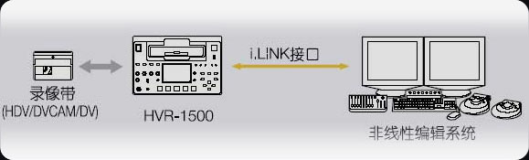 HVR-1500配备一个6芯i.LINK TM *7 *8接口。视/音频和指令信号(HDV,DVCAM和DV格式) 可以数字方式传输*6到兼容的磁带录像机上,也可通过一根电缆传输到非线性编辑系统中。