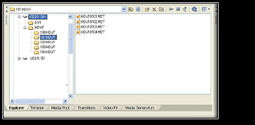HVR-DR60在开始记录时会创建一个文件夹(如“100HDVF”),记录下的视频会以电影文件格式(如“HDV10001.M2T”)自动存储到文件夹中。在进行新的记录时,又会创建一个新文件夹(如“101HDVF”),另一个新文件(如, “10101.M2T”)会被储存其中。您可以将所有的分散文件传输到计算机硬盘上的指定文件夹中,使用本软件,这一过程会变得快速而简单。您无需打开每一个文件夹来向非线性编辑系统导入电影文件,只需选择文件所在的文件夹,软件就会自动找到该文件并开始传输。
