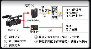 与HVR-V1C配合使用支持无磁带记录,与 Sony其它型号的HDV摄录一体机连用则需装载磁带