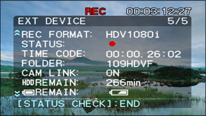 件夹名称等信息,允许随时进行检查。可随时显示摄录一体机和硬盘的状态,操作者无需将视线从拍摄的画面上
