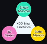 硬盘智能保护包括橡胶减震器,3G 感应器和缓冲处理器