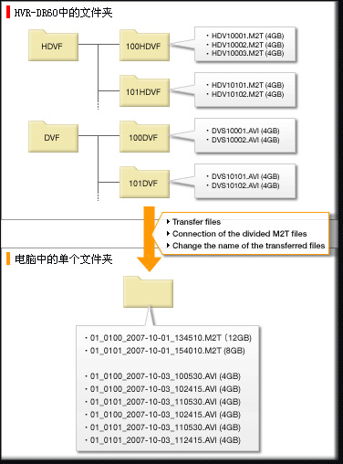 在这一过程中,会将HVR-DR60中被分成两个或更多部分的FAT32规格M2T文件合并成脚本。本软件还会在传输过程中改变文件名称,以避免名称重复。