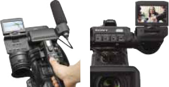 HVR-S270C摄录一体机具有新型的配置,它带有一个3.2英寸型XtraFine液晶监视器(约921,000点),以及一个XtraFine电子寻像器(约1,227,000点,852×3[RGB]×480)*。液晶屏位于电子寻像器装置上。这种独特的布局,让操作者在使用肩扛式进行拍摄的同时,可进行传统方式的寻像器监视和液晶屏监视。液晶屏可上下倾斜180度,无论摄录一体机处于高处或低处,用户都能对屏幕进行监视。270度旋转机构让用户能够在摄录一体机的前方、右侧、甚至左侧观察液晶屏,记者或导演能够看到摄录一体机正在拍摄的画面。