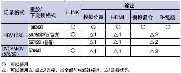 HVR-V1C 具有内置下变换功能,允许将1080i 记录内容输出为576i 信号。这些576i 信号可以通过i.LINK*6接口进行输出。此外,这些信号还能够从模拟分量、复合或S-视频接口输出,并可使用现有的DV 非编软件上编辑这些下变换后的标清素材,或在标清监视器上观看这些1080i的内容。