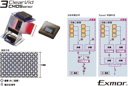 3.先进的光学镜头技术,使得Sony的3 ClearVidCMOS传感器系统即使在低照度的条件下也能拍摄出具有高分辨率、清晰的画面。