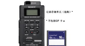 选购的l HVR-MRC1K记录存储单元可将文件记录到标准CompactFlash® (CF)卡上,从而快速、方便地在进行非线性编辑时进行交换。选购的HVR-DR60硬盘记录单元拥有60GB的大容量,可记录4.5小时的节目内容。