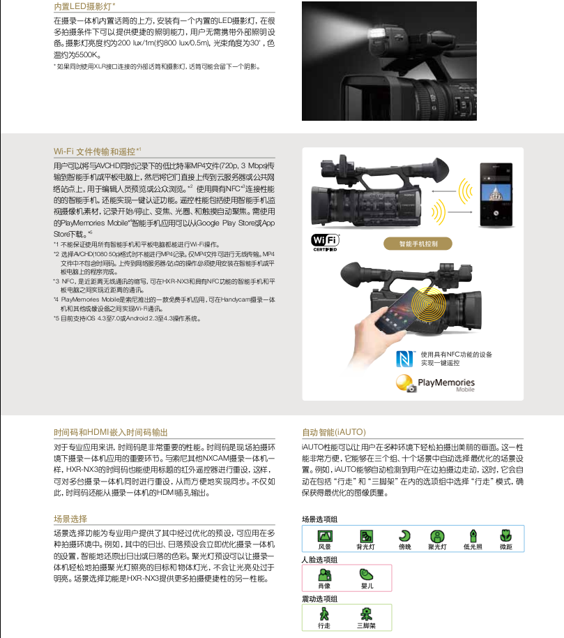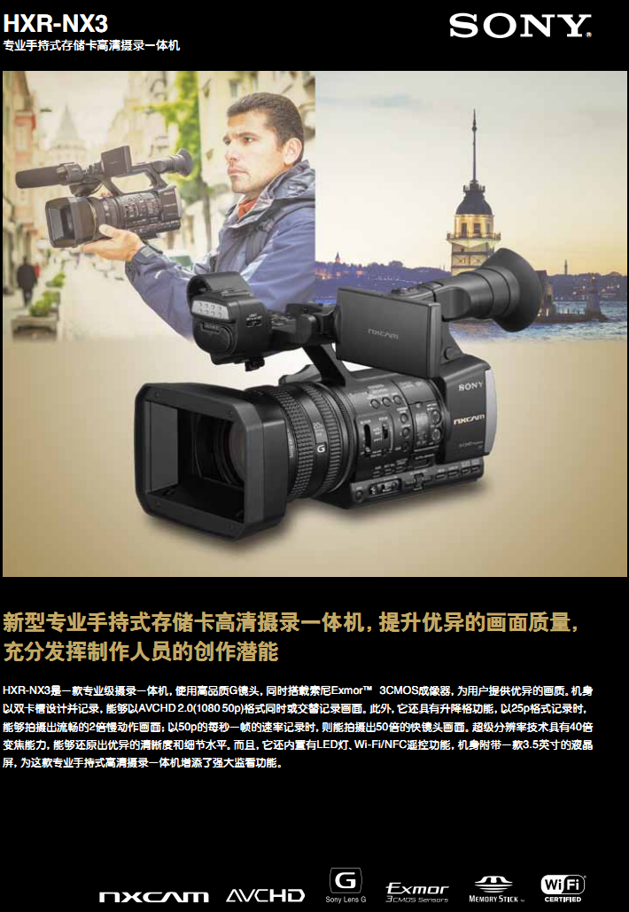 HXR-NX3手持式存储卡高清摄录一体机除了在外观设计上大胆创新以外,也积极贴近行业用户的不同需求,它适合新闻采访、事件报道、会议记录、纪录片创作等多方位拍摄应用。HXR-NX3搭载3片全高清1/2.8英寸Exmor成像器,并采用高性能G镜头,光学变焦达到20倍,同时新增的LSI清晰影像变焦技术可以在40倍变焦同时让影像质量大幅度提高。HXR-NX3可记录AVCHD2.0(1920x1080, 50p)和DV格式,同时也可记录MP4格式。新增Wifi无线传输功能可以使用智能手机和平板电脑进行遥控操作,同时针对MP4格式进行快速传输上载。为政府机关、电视台、网络新媒体、教育等更多行业用户提供更全面的解决方案。