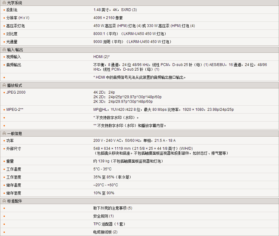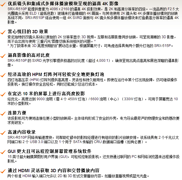 价格实惠的 4K 数字影院放映系统(适用于小型屏幕)基于备受赞誉的 SRX-R515P 的成功,SRX-R510P 为预算有限的小型影院带来索尼 4K 数字影院的真实体验。SRX-R510P 提供绚丽逼真的 4K 画质,且运行成本较低,与 SRX-515P 具有很多共同特征,包括紧凑的外形、集成式多媒体播放模块和 SXRD 技术。同样源自 SRX-R515P,SRX-R510P 弹性高压汞 (HPM) 灯阵列(由四个可单独更换的投影灯组成,而 SRX-515P 有六个灯)可提供 9000 流明的光通量。客户可以从多个高品质真实 4K 2D 投影镜头中进行选择,以满足不同规模的影厅。同时,通过添加便于连接的 3D 镜头/滤波片选件,可轻松升级到流畅、有如身临其境的 3D 画面。该易于使用的投影机具备直观的 15 英寸触摸面板用户界面,还可以通过联网的 PC 和网络浏览器进行远程控制。