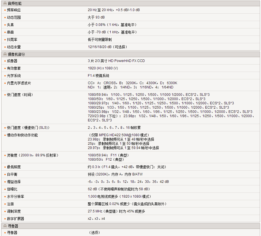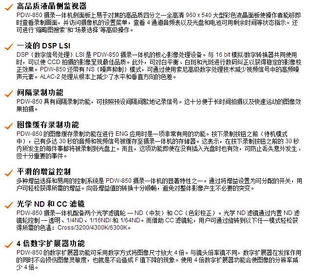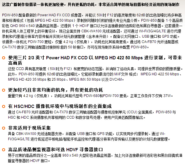 含三片2/3 英寸 Power HAD FX CCD 成像器的 XDCAM HD422 专业光盘摄录一体机,具备极佳图像质量,采用易于共享和归档的专业光盘介质