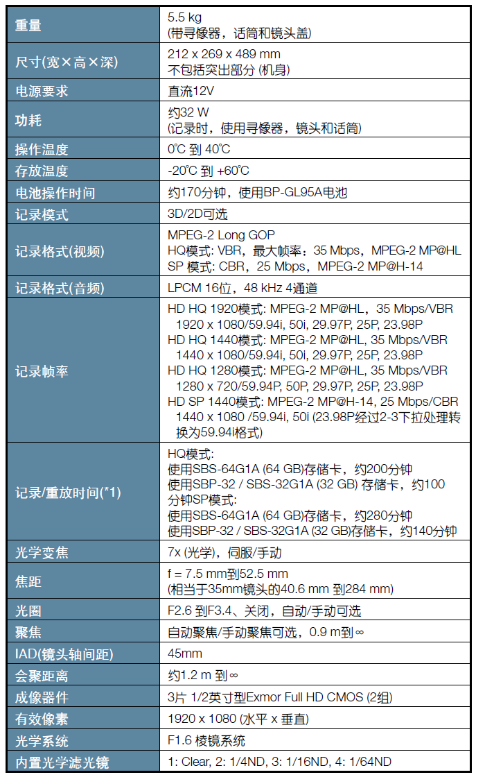 两组3片1/2英寸Exmor CMOS成像器件 每片成像器都具备1920x1080全高清有效像素 灵敏度高达F11(50i模式)。信噪比高达54dB 机身配备4个SxS卡槽,左右眼各分配2个 2张64GB SxS存储卡,可录制超过6小时 3D内容 3D/2D拍摄模式可切换,灵活性强 最新开发的双镜头系统,聚焦/变焦/光圈/汇聚调整高度精确 轴间距IAD=45mm,达到惊人的1.2m最小汇聚距离 独特的可指派多环转轮镜头设计,操作更简便 一键自动汇聚功能,3D拍摄得心应手 3D深度警告功能、格子显示功能,大大提高3D拍摄成功率 3.5’’液晶屏,具有包括混合/视差/汇聚提示/裸眼3D等6种模式 采用XDCAM EX格式,兼容成熟的XDCAM EX后期工作流程 双HD-SDI接口(左右眼)、HDMI输出接口(支持2D和3D)