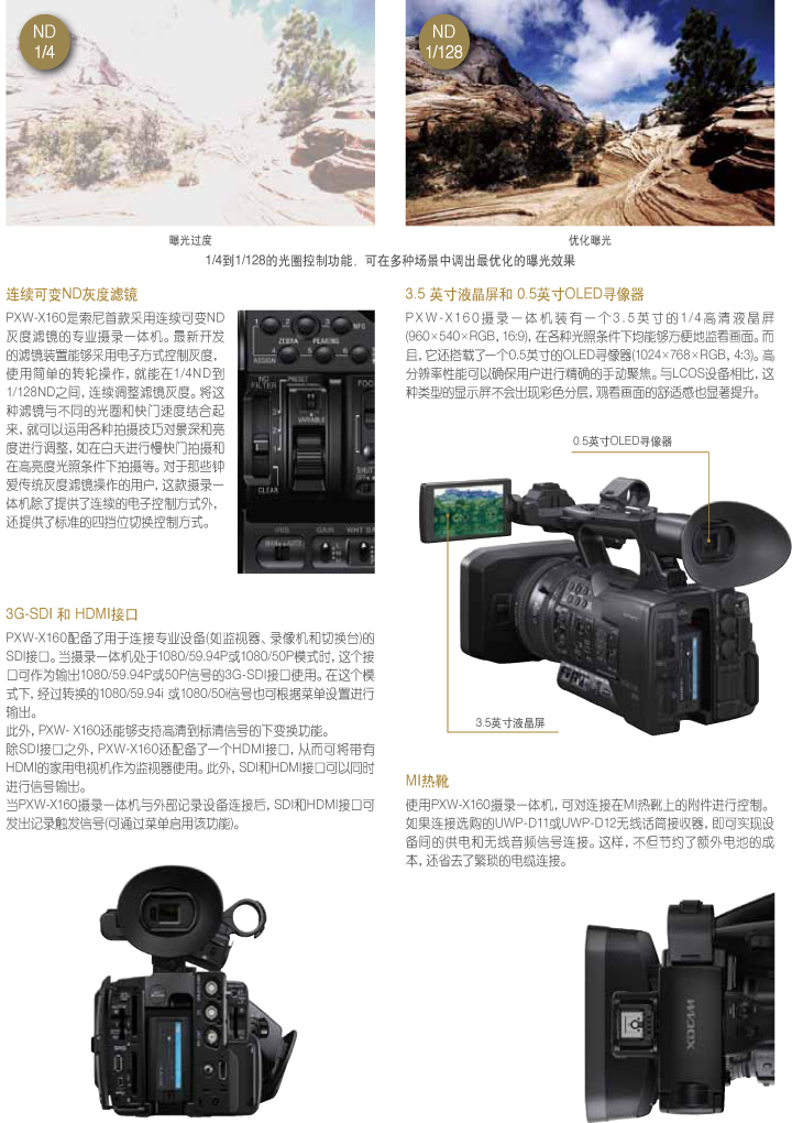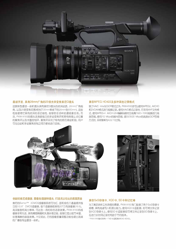 全高清 XAVC Intra 和 XAVC Long GOP 录制以及 MPEG HD 422 50 Mbps 可为广播和专业应用带来预算节省和工作流程灵活性 PXW-X160 摄录一体机配备三个 1/2.8 英寸 Exmor™ CMOS 传感器,可录制全高清 XAVC Intra、XAVC 长 GOP、MPEG HD 422 50 Mbps、MPEG HD 420 35 Mbps、AVCHD 和 DVCAM 格式,是教育领域/独立视频制作以及电视新闻等一系列广泛应用的理想之选。作为 HXR-NX5C 和 PMW-EX260 的替代产品,PXW-X160 具备许多吸引人的功能,包括双 SxS 存储卡插槽、25 倍光学变焦和 26mm 广角的 G 系列镜头以及连续可调的 ND 滤镜(提供了四档位传统机械式 4 ND 滤镜或连续可调拨盘开关,可在不断变化的光线条件下进行更多控制)。